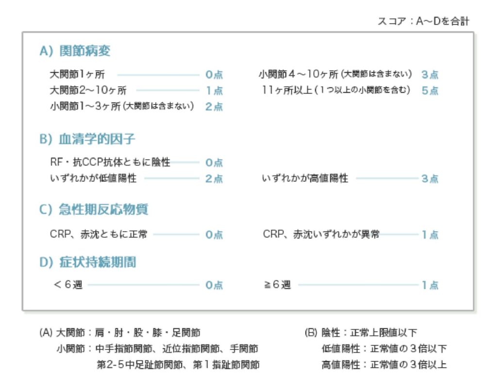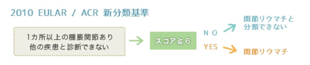 そのため、2010年に、米国リウマチ学会(ACR)、欧州リウマチ学会(EULAR)の両学会から関節リウマチをより早く見つけ出すことを目的とした分類基準が発表されました。各項目のスコアを合計して6点以上になると、関節リウマチと診断されます。