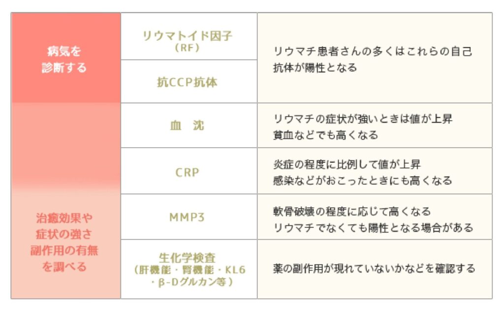 血液検査や尿検査は、関節リウマチの診断や病気の強さ、治療薬の副作用の有無をみるために行います。他の病気でも検査値が大きくなったり、陽性になることがあり、検査項目1つが条件を満たしても必ずしも関節リウマチとは限らないため、他の検査と組み合わせて診断されます。