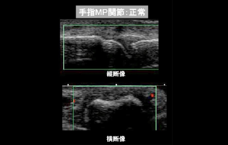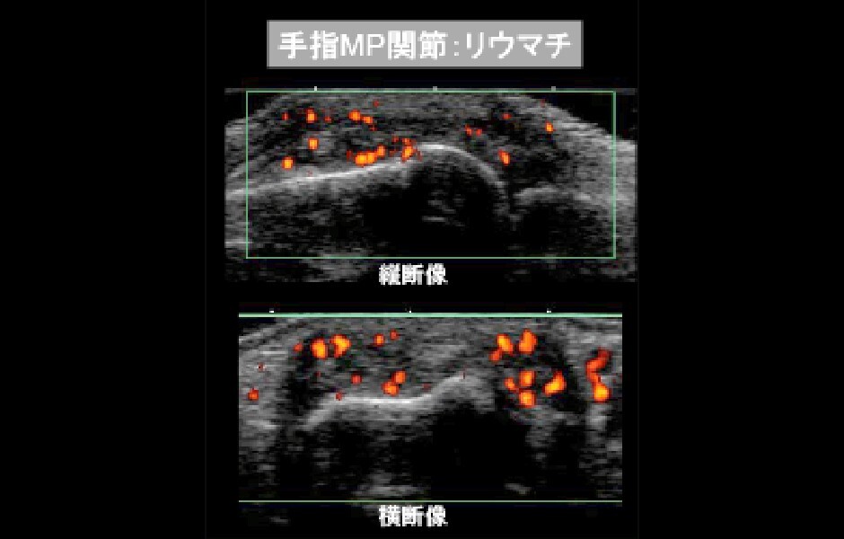 超音波検査では、グレースケールで滑膜が厚くなっていないか、滑液がたまっていないか、骨びらんがないかなどを確かめます。滑膜が厚くなっている部分ではパワードップラー法を用いて血流の状態を評価します。また関節だけでなく腱鞘の滑膜炎の存在も同時に観察することができます。