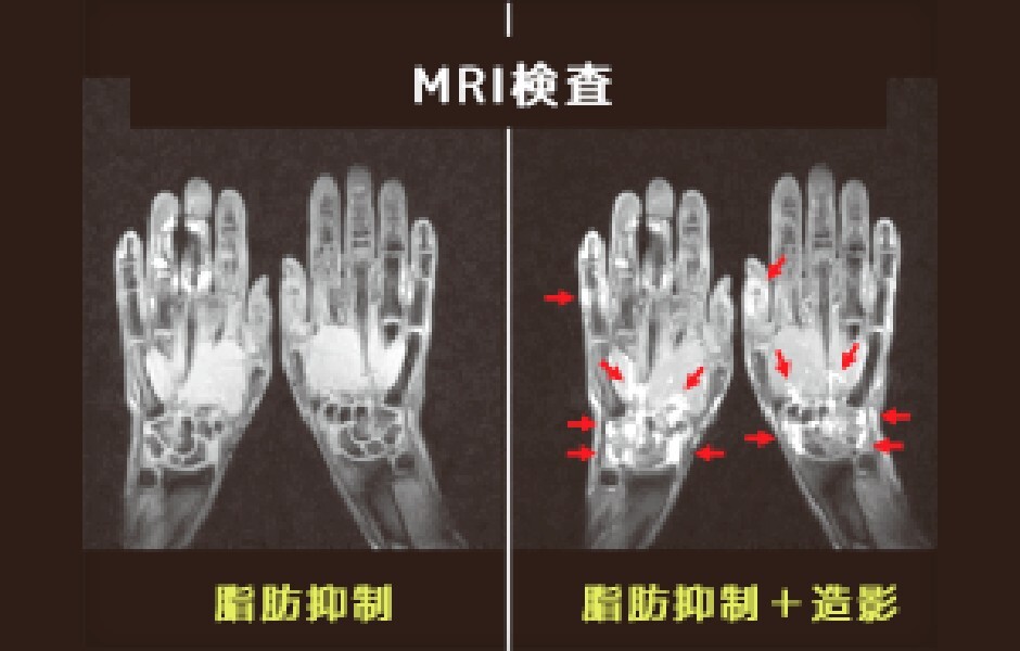 MRIは、X線写真では分かりづらい関節液や滑膜もはっきり写るため、早期診断で用いられます。