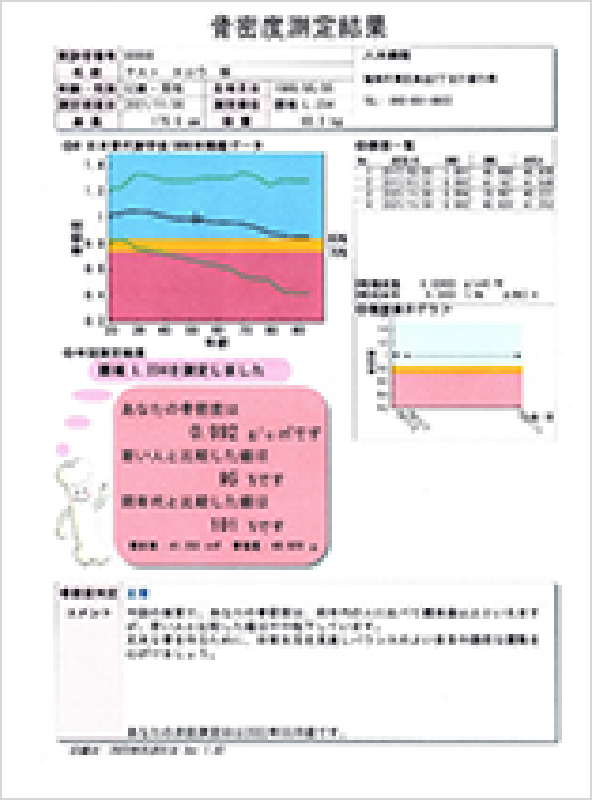 骨密度測定装置は極めて少ないX線を利用しているので、女性の方でも安心です。着衣のままベッドに仰向けになるだけで、痛みもなく簡単に測定できます。検査データは保存されますので、定期的な検査で正確な診断が行えます。
