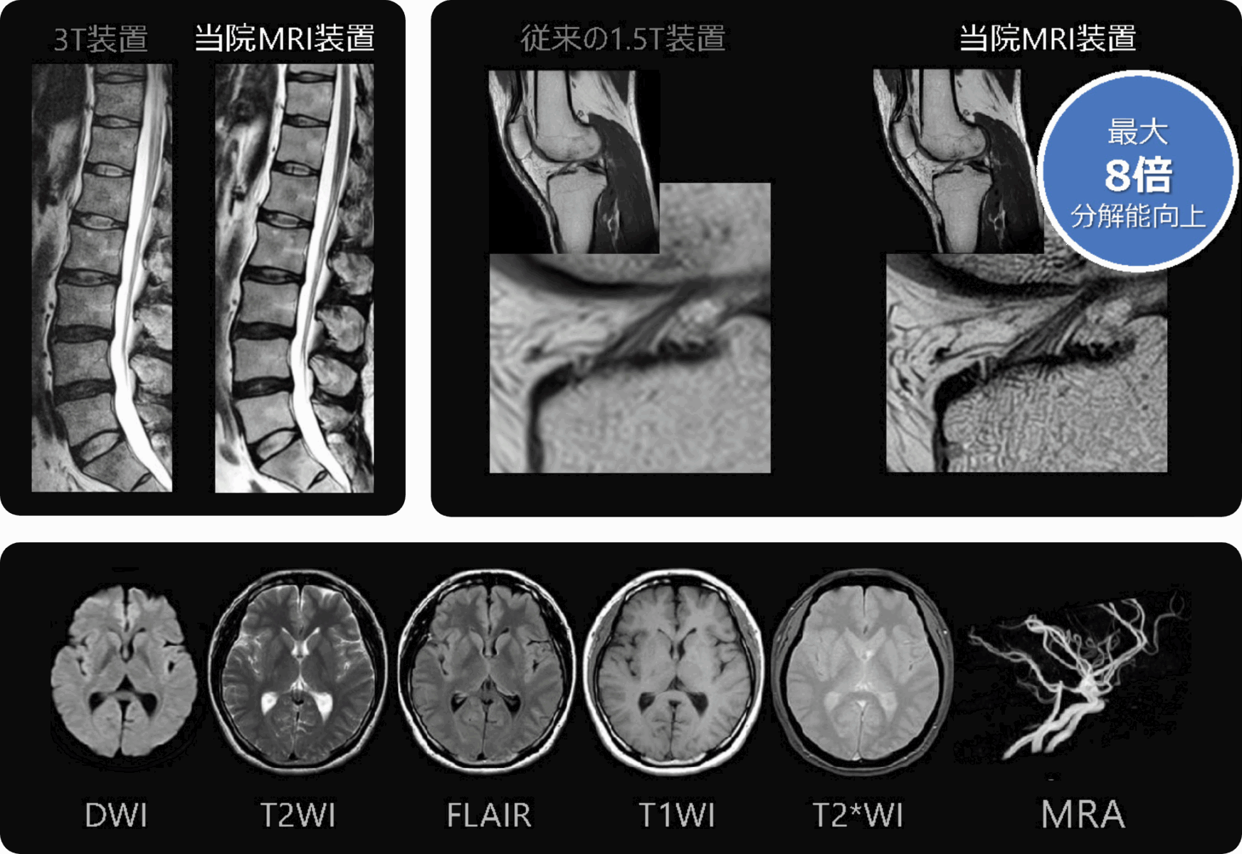 MRI装置は、磁力を使って体の様々な断面像を撮像しますので、放射線による被曝はありません。 また、頭部、四肢関節、脊椎、腹部、他全身の画像を撮像したり、造影剤を使用せずに血管・膵管・胆管等の情報を得ることもでき、全身の診断に大変効果があります。